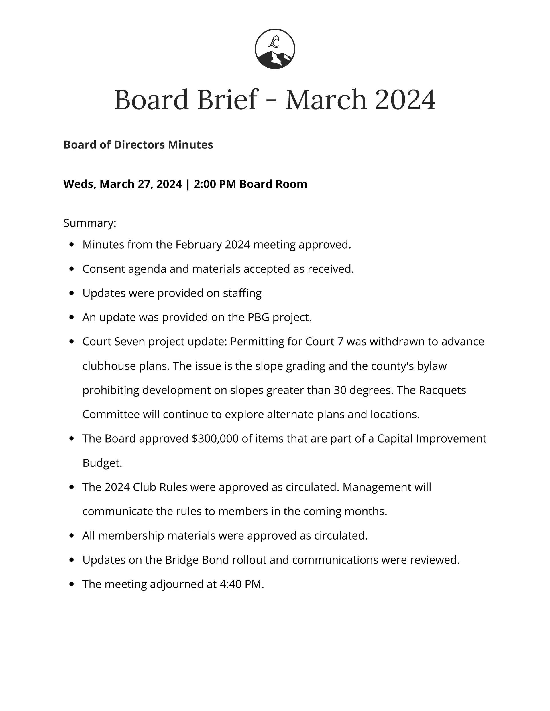 Dear Members, Thank you to all who attended the recent Town Hall and Golf Course Project update meetings. Your participation and thoughtful engagement are essential as the board, management, and our committees strive to better understand how we plan for the future of La Cumbre. Over the next 45 days, the Board, Club Management, and the Finance Committee will be developing financial models that reflect the full scope of our campus-wide capital needs. These models will help inform project timing, prioritization, and funding strategies—including potential borrowing. As a reminder, any borrowing the Board recommends which exceeds $500,000 will require a member vote. In late June, the Board will hold a two-day planning retreat to review these options and map out a clear, disciplined path forward. We are committed to keeping members informed and equipped to make thoughtful decisions. We anticipate holding additional member forums to provide the needed context on these matters later this summer. If you were unable to attend the Town Hall, a recording is available HERE . We also encourage members to explore the Governance section of the member website, where you’ll find meeting minutes from all Board and committee meetings. Click the image below or HERE to view our Q1 2025 Update. Please continue to reach out with your questions, comments, and ideas. We deeply value your feedback as we work together to steward the long-term health and vitality of the Club. Warm regards, Tracy Jenkins President, Board of Directors La Cumbre Country Club